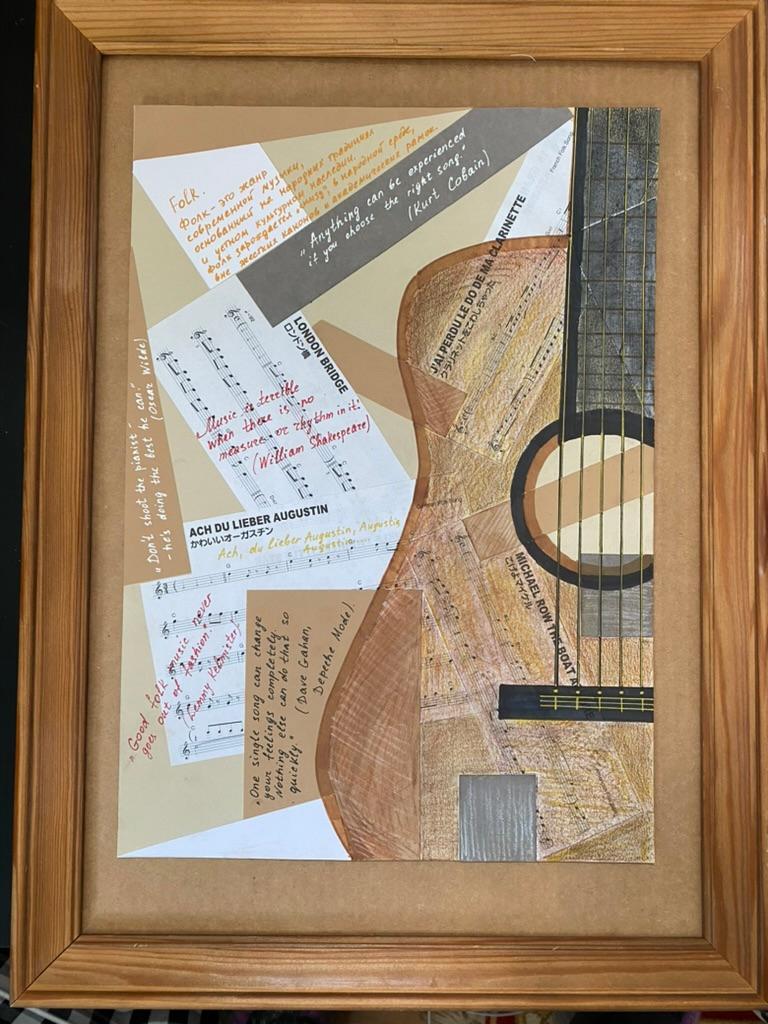 2024, collage, mixed media, metallized strings, paper A3 This mixed media collage presents a guitar as the central element, surrounded by music sheets and quotes from legendary voices across cultures and times. The notes are arranged in the folk and classical music style, symbolizing the universality of guitar sound. Each quotation is preserved in the author’s native language - Shakespeare in English, German folk songs, Russian folk traditions, Kurt Cobain, Dave Gahan, and others - adding authenticity and depth. The guitar here becomes a symbol of both simplicity and boundless expression - from ancient folk tunes to modern rock ballads. This artwork embodies the idea that music transcends borders, capturing emotions in both word and sound. Perfect as wall art for living rooms, music studios, rehearsal halls, or creative spaces, and a meaningful gift for guitarists or music lovers.