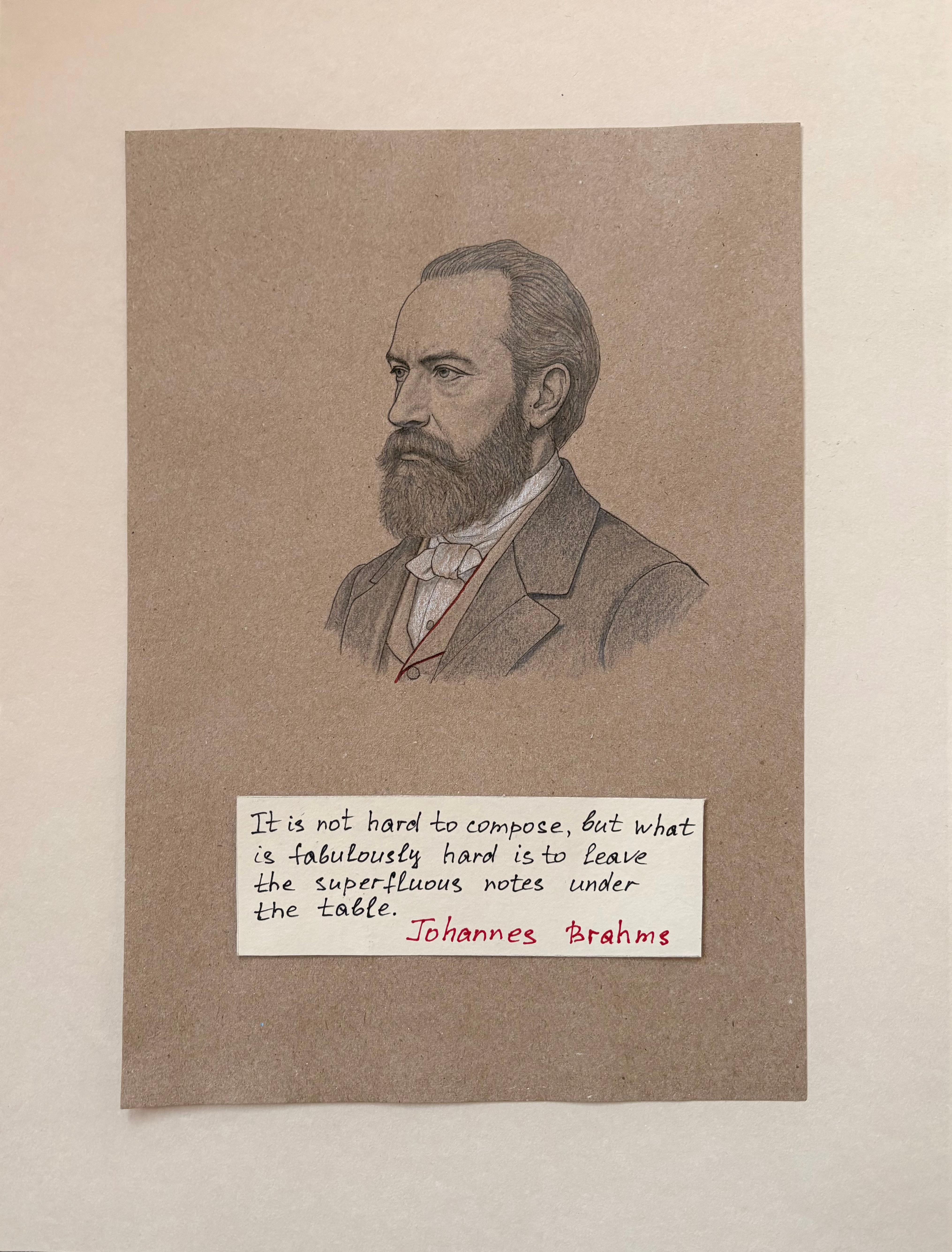 Drawing on kraft paper using charcoal and graphite pencils (black and white), with collage elements and a handwritten quotation by Johannes Brahms; mounted on cardboard. Total size including backing: A3. 2026 The portrait of Johannes Brahms emphasizes restraint and reduction. The calm, measured drawing contrasts with the conceptual weight of the quotation, which points to the act of removal rather than accumulation. The composition reflects a process of refinement, where meaning emerges through limitation. Brahms appears here not as a figure of expansion, but of precision—where music is defined by what is deliberately left unsaid.