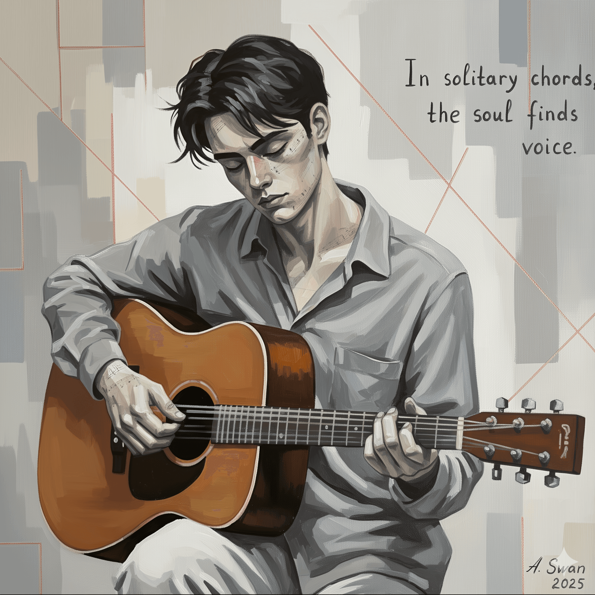 Only the print is available. 2026. Limited edition print (5 pieces): 50 × 50 cm on canvas or on board. A solitary guitarist is captured in a moment of inward concentration, where music exists before it is performed. The figure does not address an audience, but listens to the resonance held within the instrument. Restrained tones shape the body and surrounding space, while warmer colors are reserved for the guitar, emphasizing sound as a perceptual center. The work reflects solitude as a state of heightened attention, where silence and sound converge into a private inner voice.
