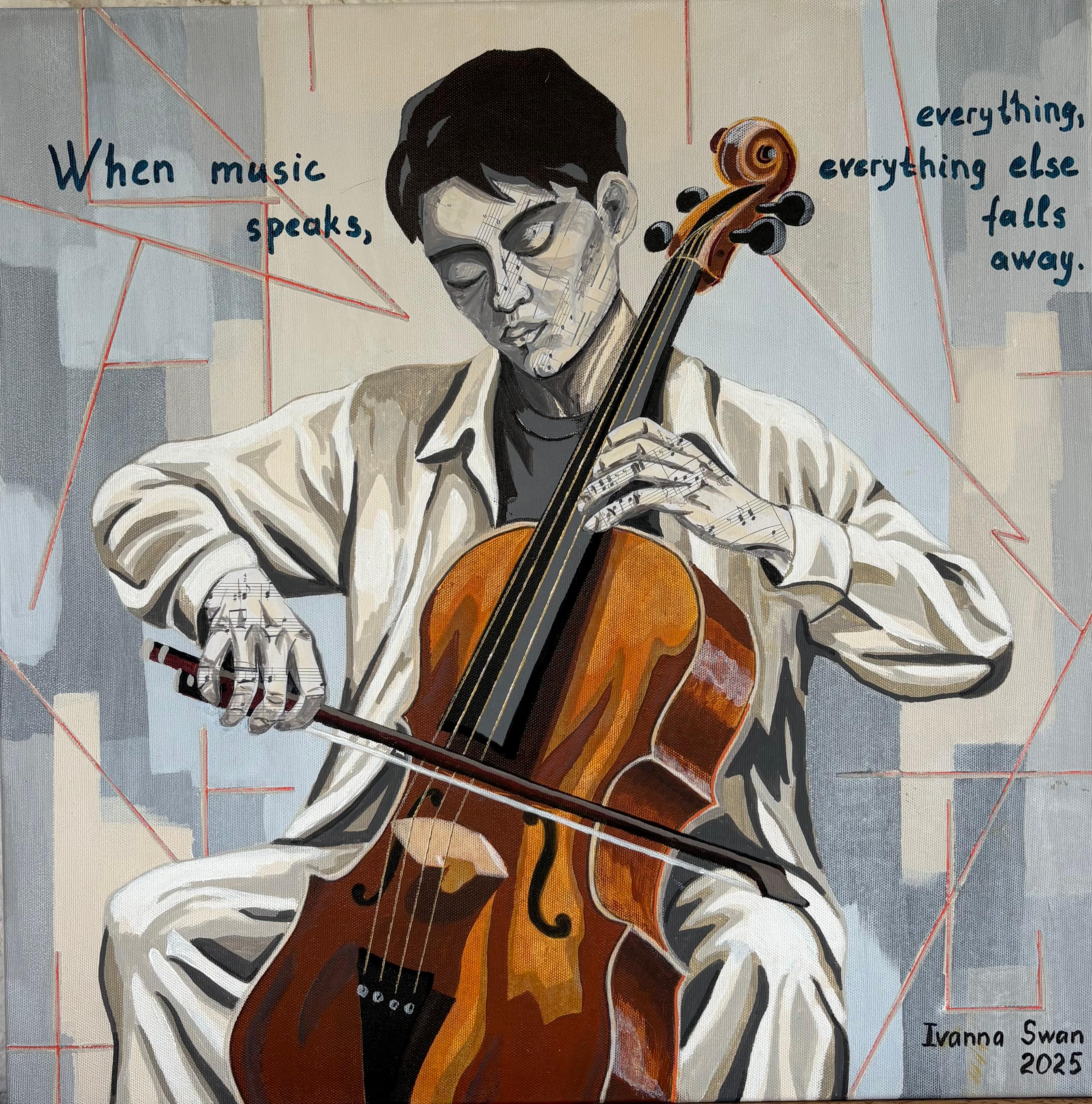 2025, Acrylic painting, canvas on a stretcher, mixed media, with collage elements in music paper, 50x50x1.5 cm Portrait captures the intimate moment when music overtakes thought and becomes pure emotion. The composition focuses on the quiet dialogue between the musician and the cello, using fragmented planes, expressive lines, and warm contrasts to reflect the inner tension of creation. Blending contemporary figurative portraiture with subtle abstract elements, the work explores how sound shapes identity and how music can speak without words.