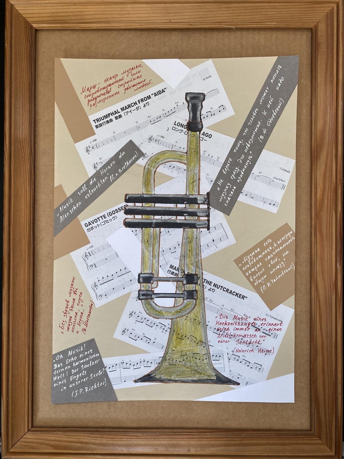 2024, collage, mixed media, paper A3 This mixed media collage features a trumpet placed at the center, surrounded by authentic music sheets and timeless quotes from great composers and writers. All notes are given in the classical music style, representing marches and orchestral traditions. The quotations are preserved in their original languages — Beethoven and Heine in German, Tchaikovsky and Odoyevsky in Russian, and others — giving the artwork authenticity and cultural richness. The piece highlights the symbolic power of the trumpet as an instrument of triumph, celebration, and emotional expression. It reflects the idea that music transcends language, carrying universal meaning through sound. Perfect as a gift for musicians, brass players, or anyone who loves the energy of classical music. Ideal as wall art for living rooms, music studios, rehearsal spaces, or creative interiors.